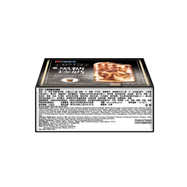 Ingredients: Water, Mini Mochi-Brown Sugar (Maltose, Acetylated Distarch Adipate, Water, Brown Sugar, Cocoa Powder, Flavor (Brown Sugar), Flavor (Propylene Glycol, Water, Cinnamic Acid, Ethyl Maltol), Glutinous Rice Powder, Tapioca Starch, Potato Starch, Palm Oil (Antioxidants (Vitamin E))), Maltose, Sugar (Sugar, Caramelizing Sugar), Coconut Oil, Fructose, Skim Milk Powder, Brown Sugar, Cream, Whey Powder, Food Coloring (Caramel (E150a), FD&C Yellow#5 (E102&E110)), Cornstarch, Maltodextrin, Emulsifiers (Mono and di-glycerides of fatty acids (E471), Polysorbate 80), Flavors, Thickeners (Sodium Carboxymethyl Cellulose, Locust Bean Gum, Carrageenan, Guar Gum, Sodium Alginate), Salt